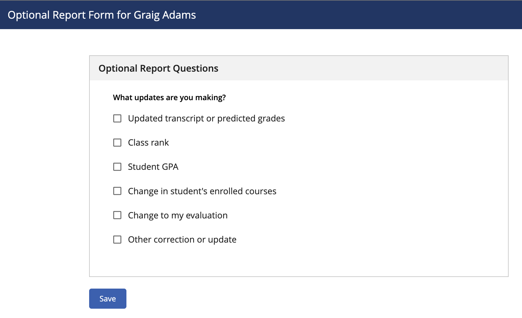 The Optional Report (OR) may be used at any point in the academic year to submit updated grades and/or transcripts to colleges in Common App. The OR can also be used to correct any errors previously submitted. It should not be used as a substitute for the Mid Year or Final Report and can only be submitted once an application year. The OR will be available to all colleges in Common App once it is submitted.