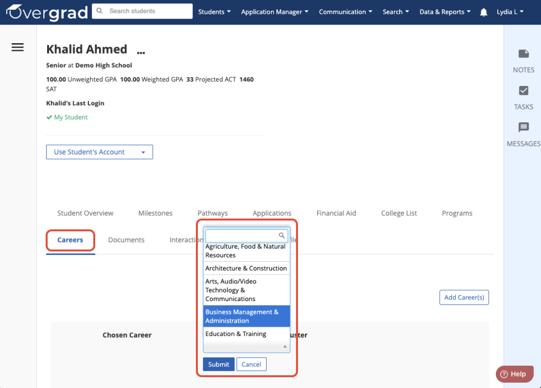 For Educators, this field can be logged from the Careers tab of an individual student’s page. It includes the same career cluster options as the STARS College and Career Planning Tracker.